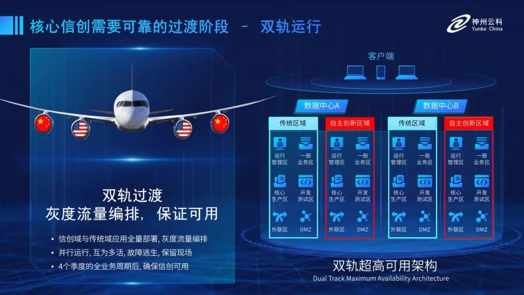 為幫助客戶更好地應(yīng)對(duì)數(shù)字經(jīng)濟(jì)時(shí)代對(duì)應(yīng)用可持續(xù)性的高要求,實(shí)現(xiàn)信創(chuàng)與數(shù)字化兼得,leyu.樂(lè)魚(yú)推出了雙軌超高可用架構(gòu)。雙軌超高可用架構(gòu)在雙活數(shù)據(jù)中心的分區(qū)調(diào)度基礎(chǔ)上,增加信創(chuàng)域和非信創(chuàng)域的分域調(diào)度,實(shí)行信創(chuàng)域與傳統(tǒng)域應(yīng)用全量部署,使雙中心運(yùn)營(yíng)變?yōu)殡p中心四區(qū)域并行運(yùn)行,互為多活,將傳統(tǒng)架構(gòu)變?yōu)榉謪^(qū)分域協(xié)同的多活雙軌超高可用架構(gòu)。幫助客戶在新架構(gòu)下,保障“信創(chuàng)”的同時(shí)解決性能瓶頸,提升穩(wěn)定性,保證應(yīng)用可持續(xù)性,最終實(shí)現(xiàn)信創(chuàng)區(qū)域和非信創(chuàng)區(qū)域的平滑過(guò)渡,完成國(guó)產(chǎn)化替代目標(biāo)?!?/p>