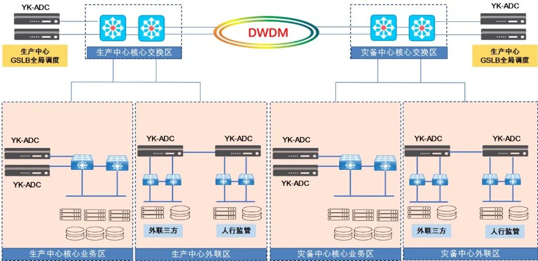 生產(chǎn)中心和災(zāi)備中心為對稱部署,兩個中心使用波分技術(shù)實現(xiàn)互相連接;